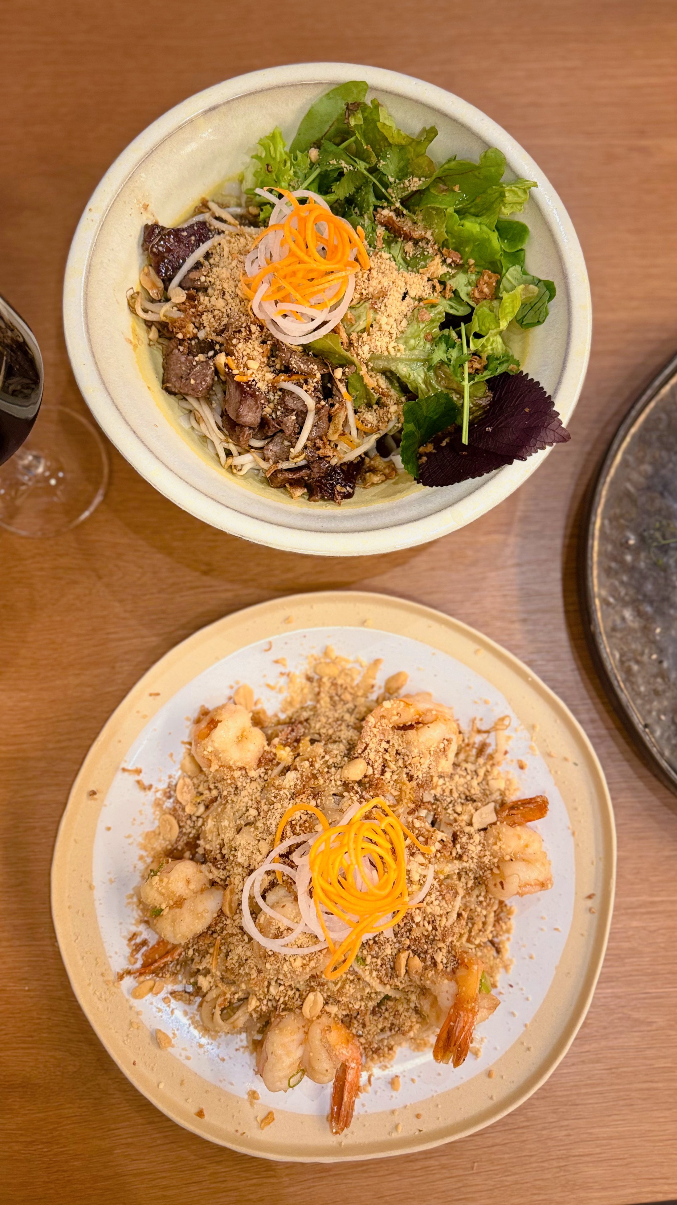 Nr. 38 „We stayed“ (24,90 €)– Reisbandnudeln mit gebratenem argentinischen Entrecôte, Kräutern, Sojasprossen, Röstzwiebeln und Erdnuss. Lauwarm, frisch, rauchig – wie ein vietnamesisches Phở ohne Suppe. Ein Gericht, das in Erinnerung bleibt.